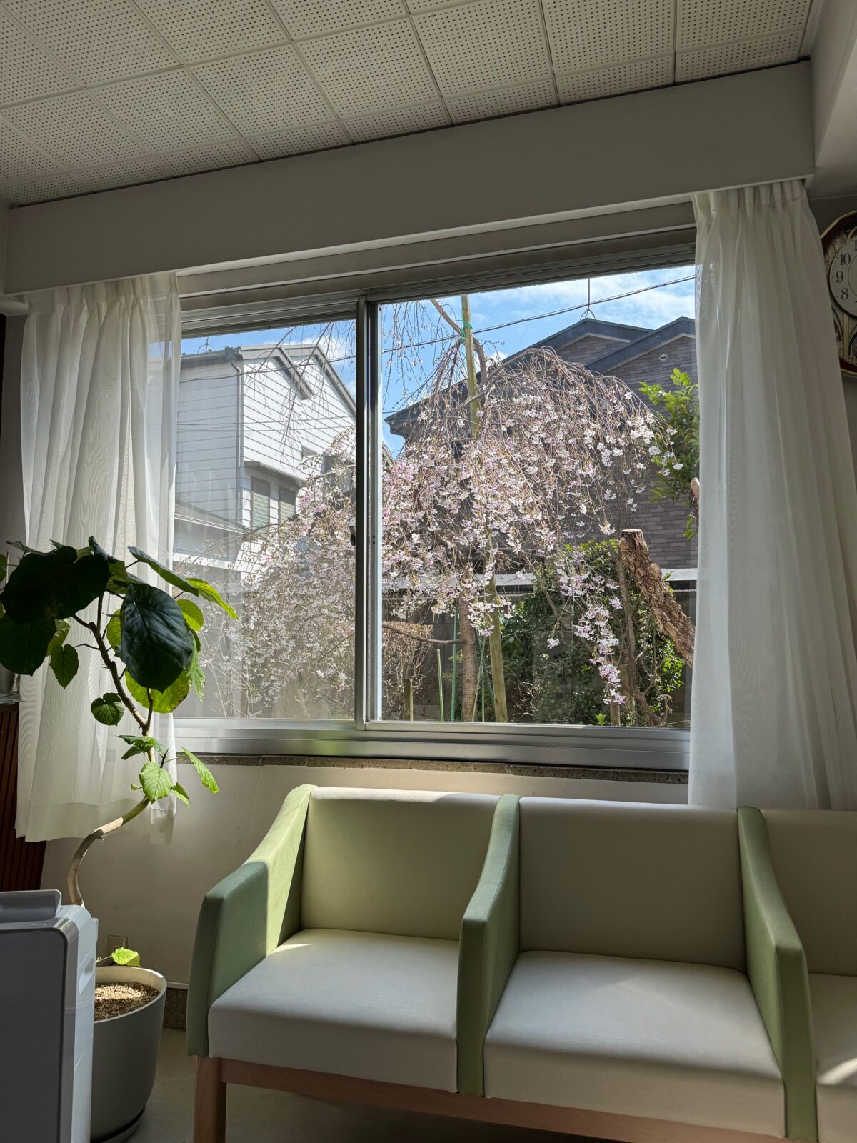 当院の待合室から見える枝垂れ桜が、現在見頃を迎えています。ご来院の際には、待ち時間のひとときに季節の移ろいを感じていただければ幸いです。